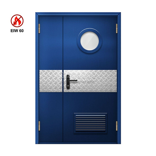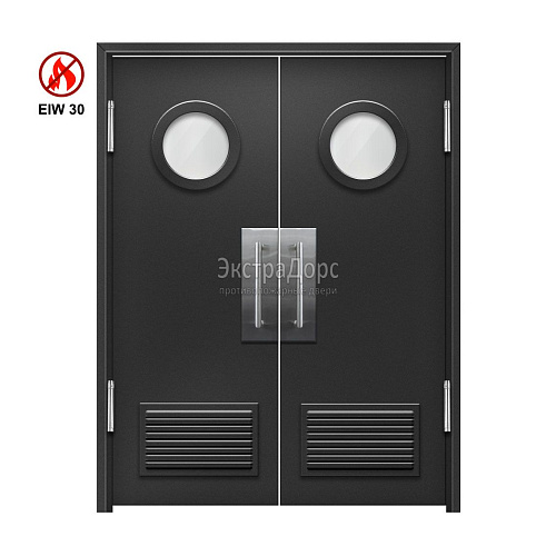 Двупольная огнестойкая дверь с решёткой EI 30 ДО-02-EI-30 двупольная остеклённая с иллюминаторами и антипаниками