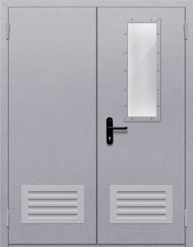 Двухстворчатая огнеупорная дверь EI 60 с выпадающим порогом, стеклом и решеткой