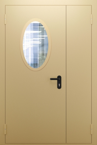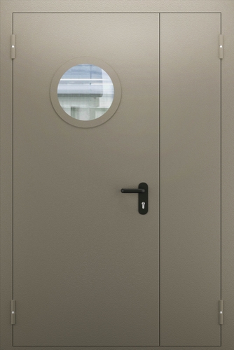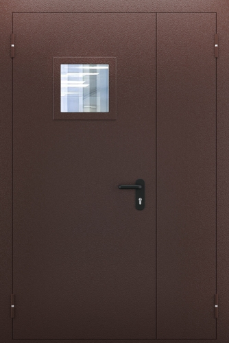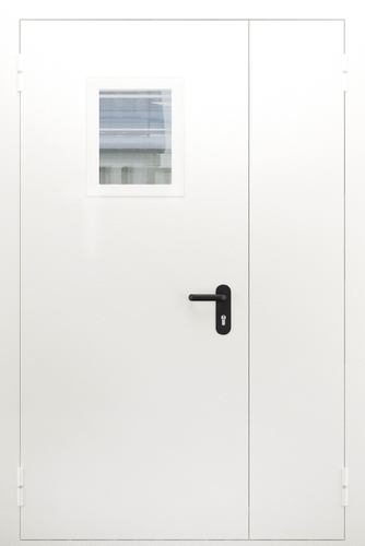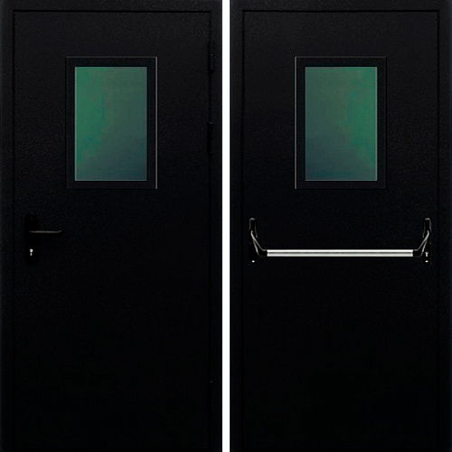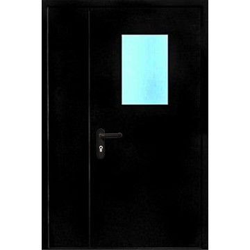 Распашная дверь противопожарная полуторная черная с окном порошковое напыление