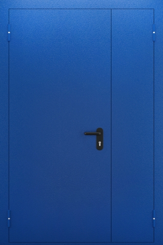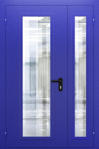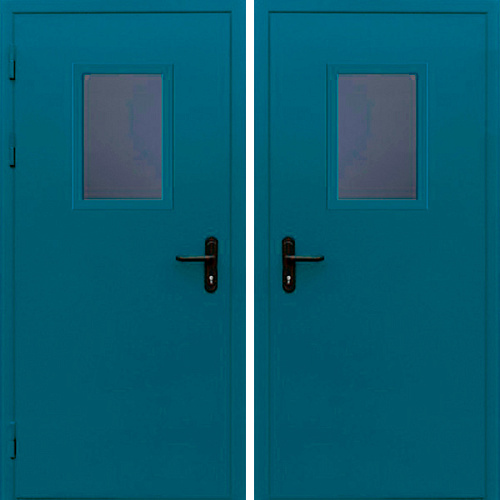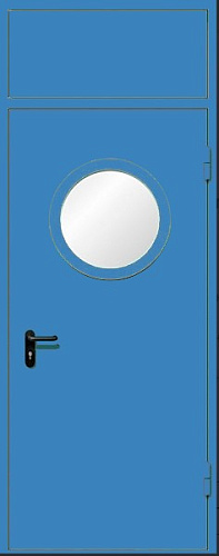 Распашная дверь противопожарная синяя с окном порошковое напыление