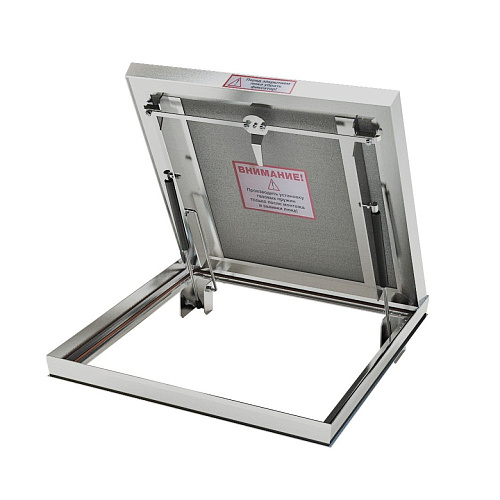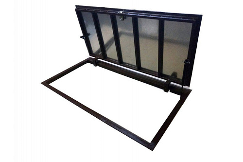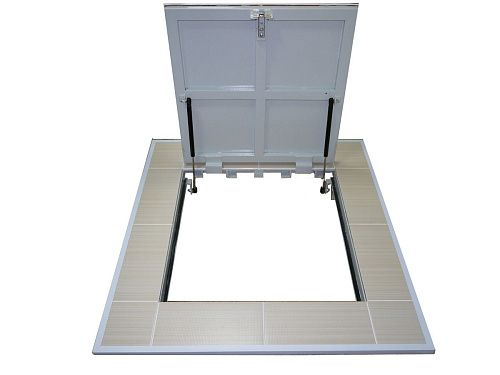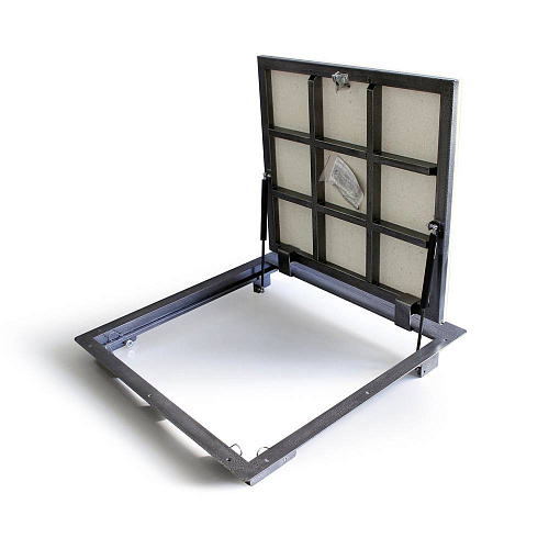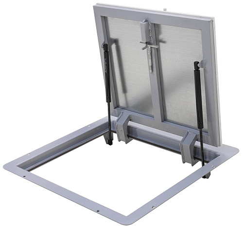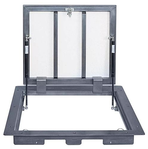 - Люк напольный с амортизаторами. Напольные противопожарные люки с газовыми амортизаторами устанавливаются на уровне пола и обеспечивают плавный доступ к скрытым коммуникациям или подземным структурам.