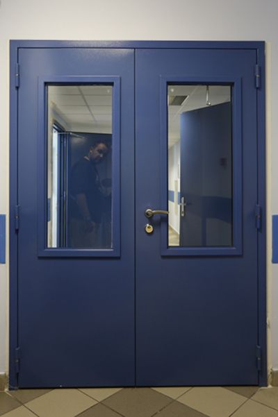 Противопожарная алюминиевая дверь синего цвета в Воскресенске